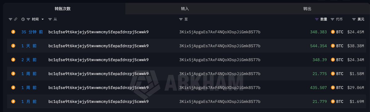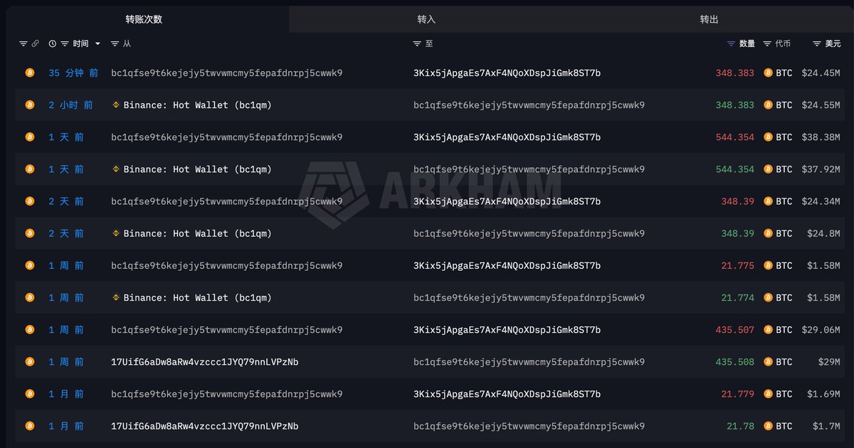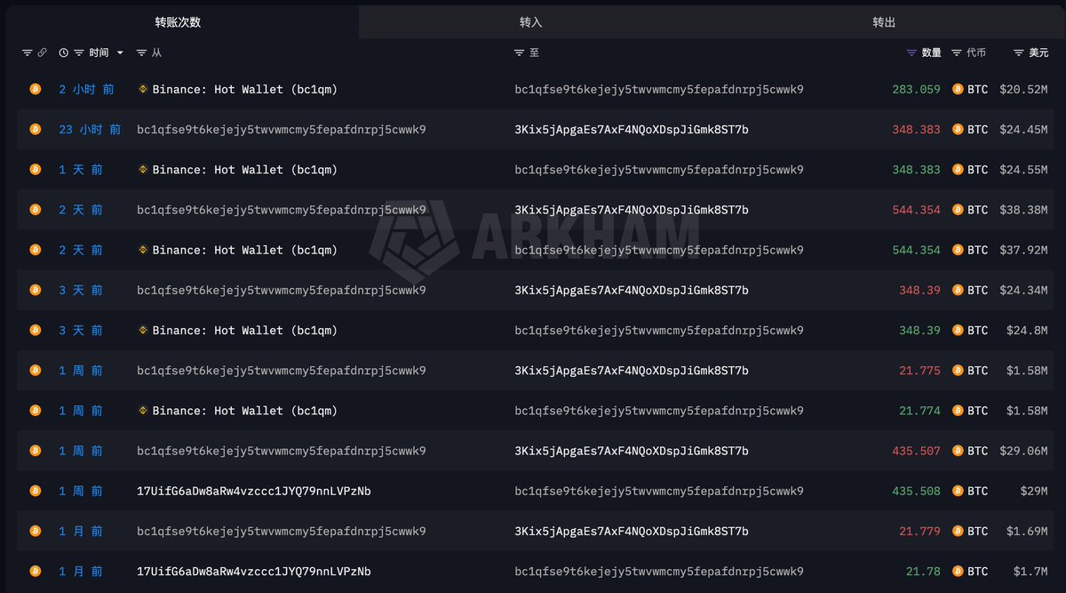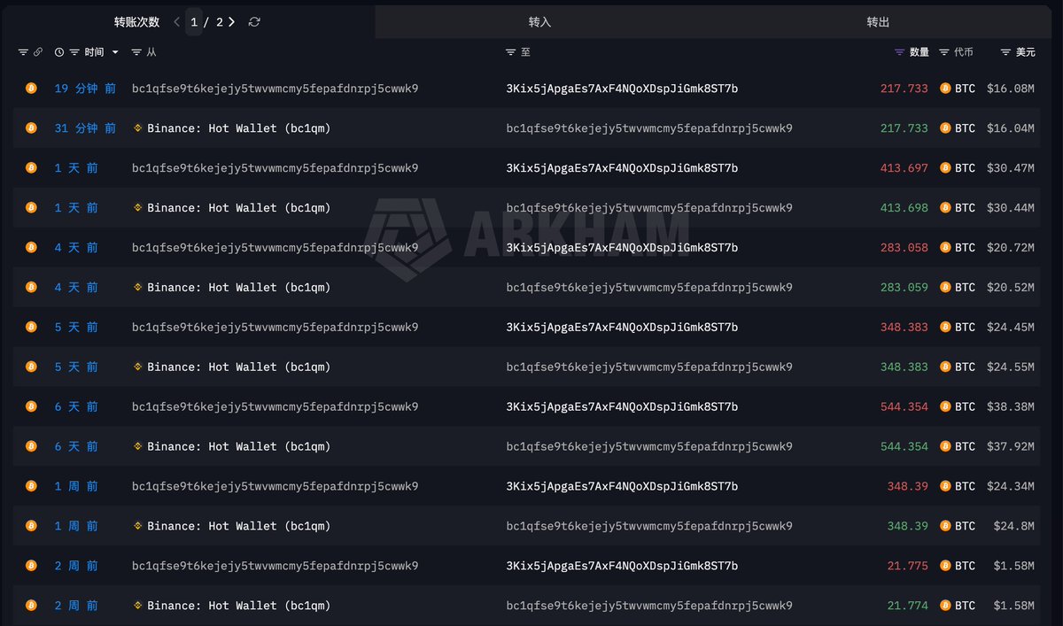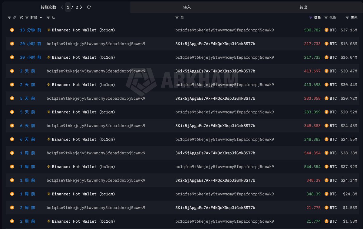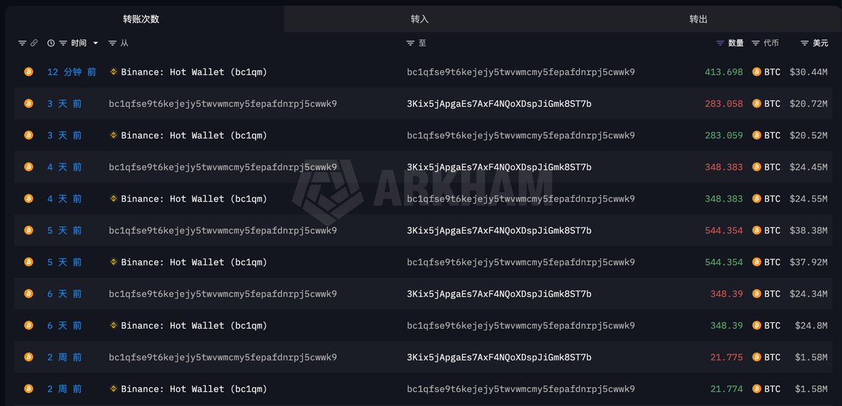 近期持续从 Binance 提出 BTC 的巨鲸/机构,20 分钟前再从 Binance 提出了 500.7 枚 BTC ($3716 万)。