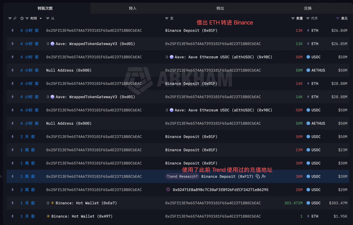 ◎一周前,这个地址转了 1.5 亿 USDC 进 Binance,其中一笔使用了 Trend Research 已知的 Binance 充值地址。