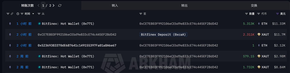 他通过两个地址,把 4,480 枚 XAUt ($2270 万) 转进 Bitfinex,然后从 Bitfinex 提回 10,242 枚 ETH。ETH 买入价格 $2,140。