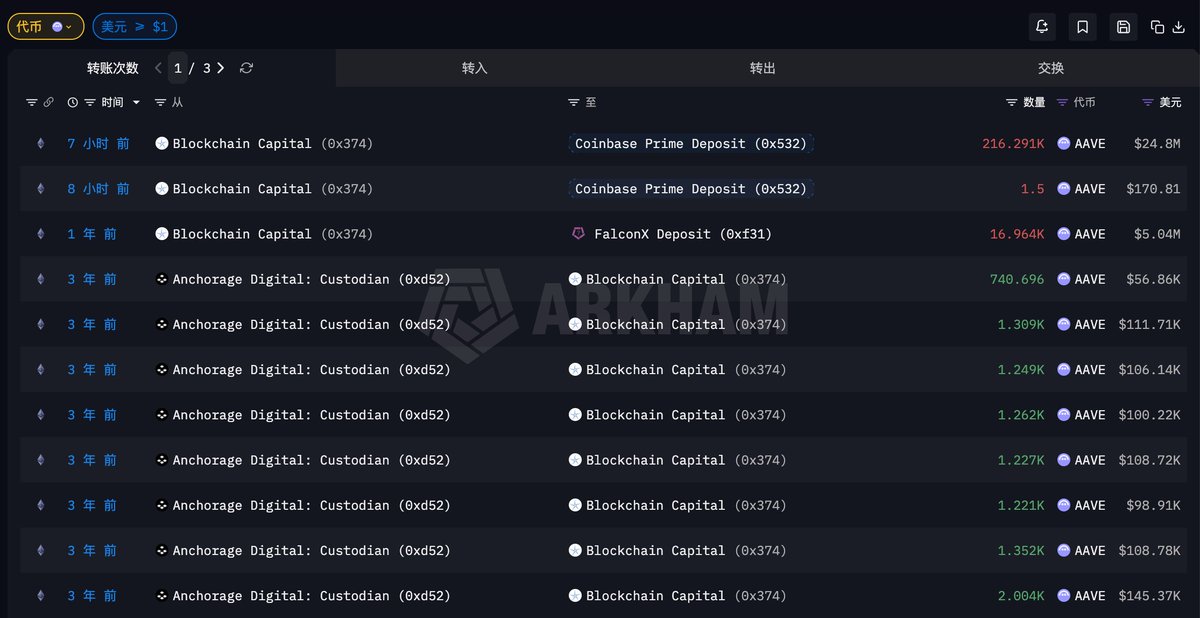 今天投资机构 Blockchain Capital 也把持有的全部 21.6 万枚 AAVE ($2480 万) 清仓转进 Coinbase Prime。