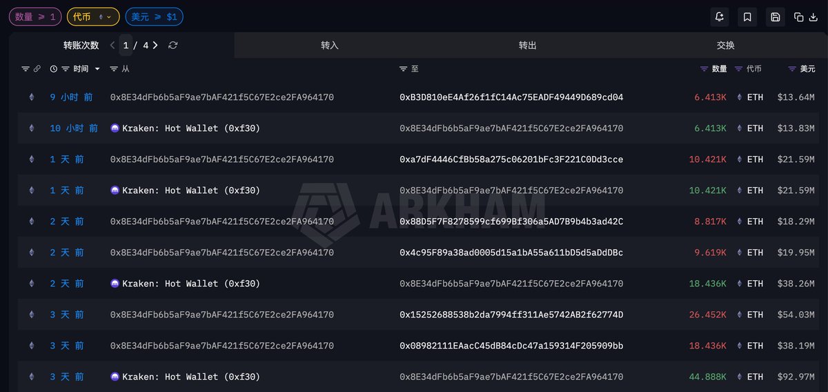 现在,他已经在最近 4 天时间里通过 Kraken 囤积高达 80,159 枚 ETH ($1.66 亿),均价 $2,079。