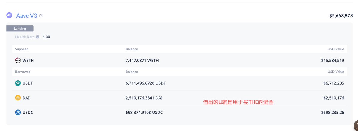 1⃣先是通过 0x7a7...234 地址从 Tornado 收到 7,400 枚 ETH,然后存进 Aave 抵押借款 992 万 U (包括 USDT、DAI、USDC) 再转移到多个钱包用于购买 THE。