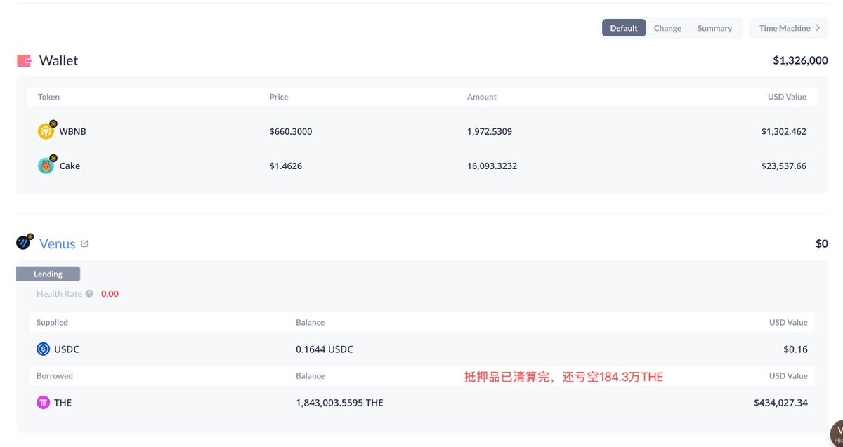 3⃣40 分钟后 THE 价格暴跌 (很可能是他的平多开空),他在 Venus 上的抵押品被清算并助推 THE 价格进一步下跌。最终这两个钱包的抵押品被全部清算完,但还剩下约 $215 万 (118 万 CAKE+184 万 THE) 的借款尚未偿还,成为了 Venus 的亏空。