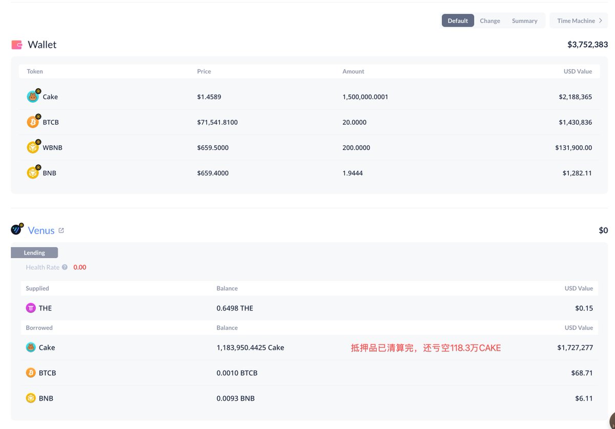 导致了 Venus 产生约 $215 万的清算亏空 (118 万 CAKE+184 万 THE),而黑客从 Venus 拿到了约 $507 万资金 (2,172 BNB+151.6 万 CAKE+20 BTC)。