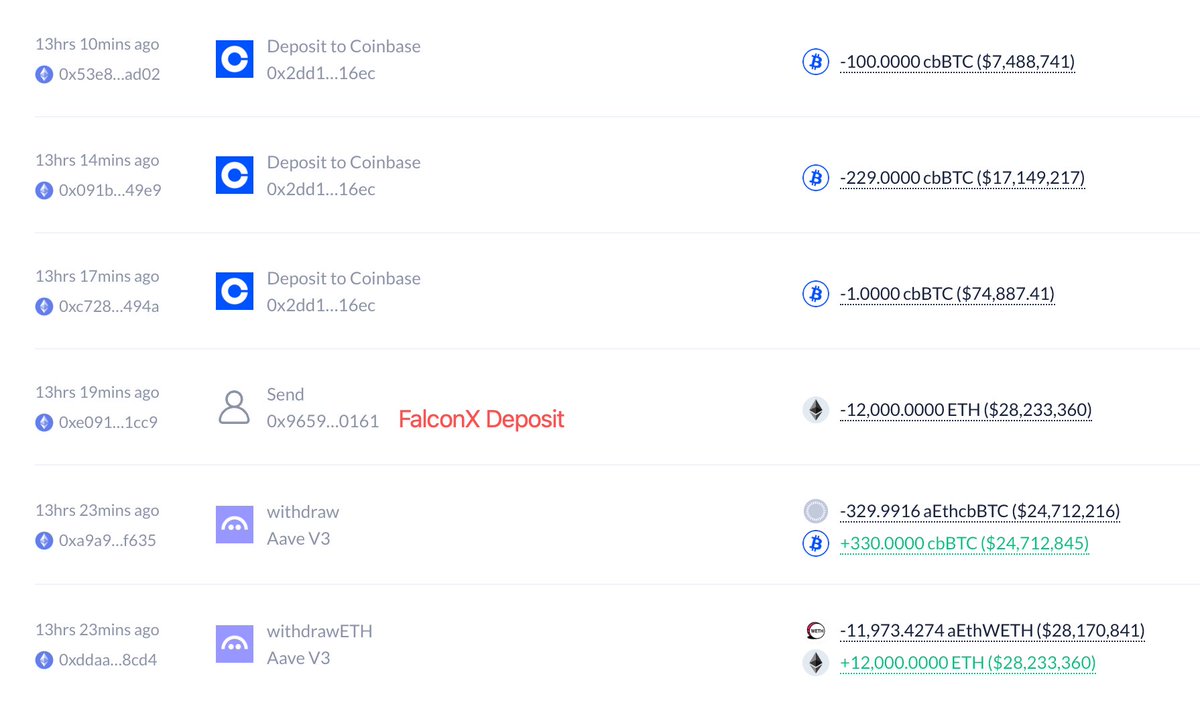 2024 年 12 月价格 AAVE 价格最高的时候他们通过 FalconX 卖了 1.69 万枚 ($504 万),剩下的就全在今天转进了 Coinbase Prime。