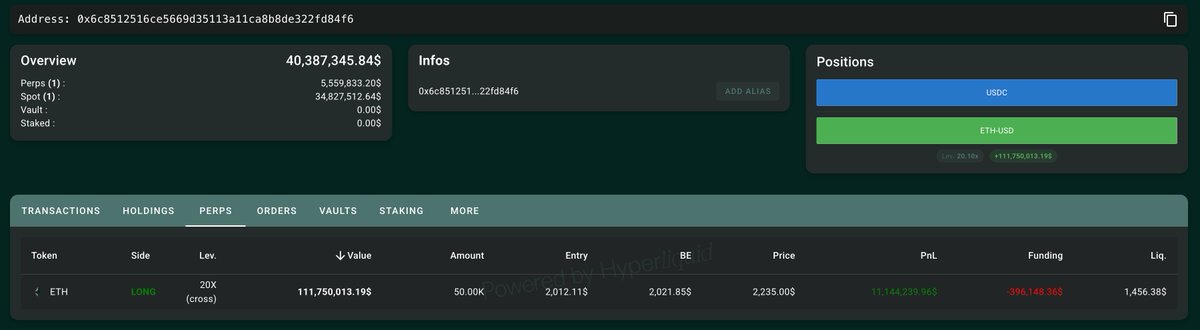 昨天早上,[Hyperliquid 最大多军头子] 在 ETH 价格 $2,361 时止盈平多了 4 万枚 ETH,实现 $1480 万的盈利。