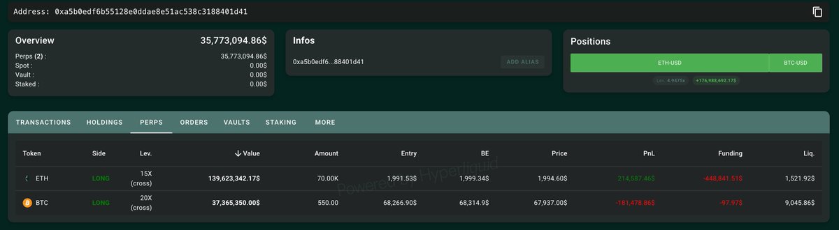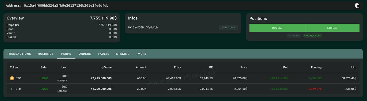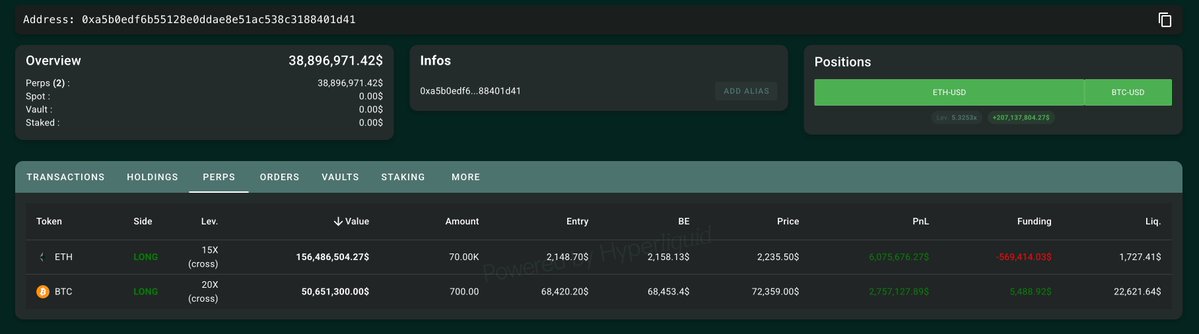 现在,他的做多仓位重新回到 $3.2 亿:12 万枚 ETH + 700 枚 BTC。