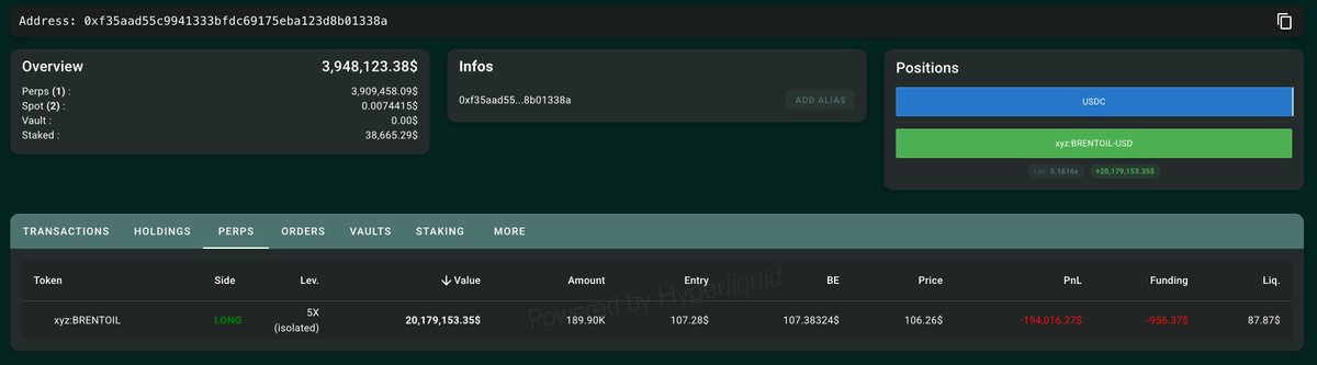 在原油价格上涨后,一个鲸鱼在 15 分钟前把 410 万 USDC 转进 Hyperliquid,然后以 5x 杠杆梭多了价值 $2000 万的布伦特原油。