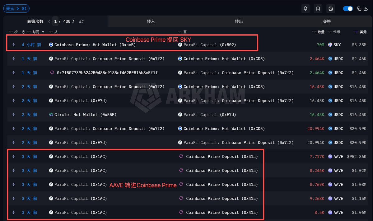 一周前投资机构 ParaFi Capital 卖出 $AAVE 换仓至 $SKY ;