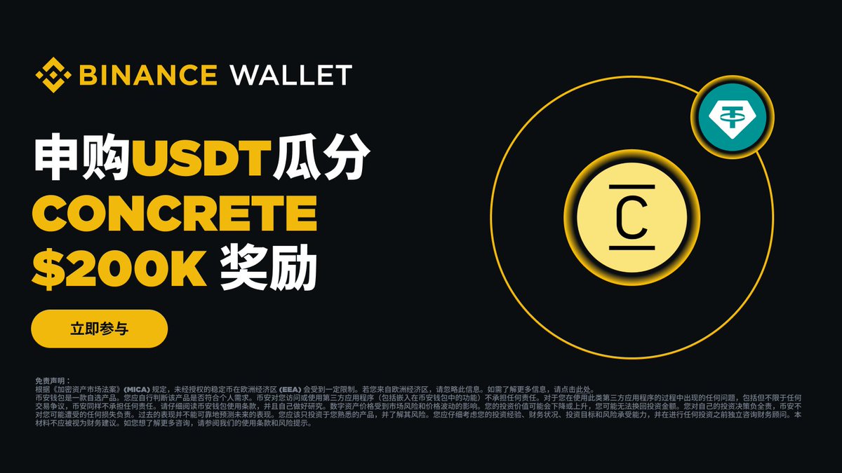 币安最近上线的 Concrete 的理财活动,总奖励 20wu。基础APR是8.41%, 加上现在的活动奖励年化3.89%,整体13%➕的年化(年化会随着参与人数变化),现在这个行情来说挺香的。