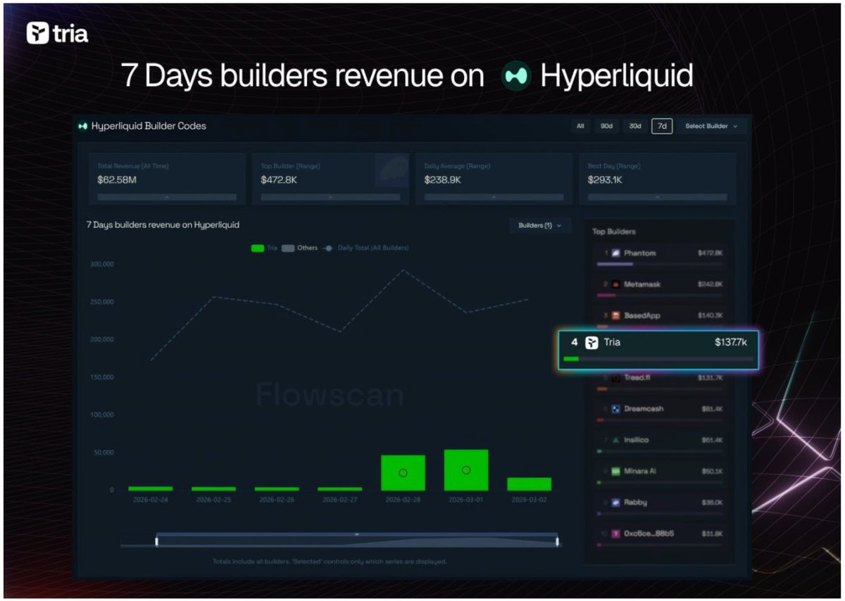 这对 Hyperliquid 生态释放了一个关键信号:资本正从“虚高交易量”的叙事中撤离,转向能产生真实收入的建设者。 Tria 用30天证明了自己不仅懂技术,更懂市场需求。这种执行力,让我对其后续的发展方向和生态布局充满期待