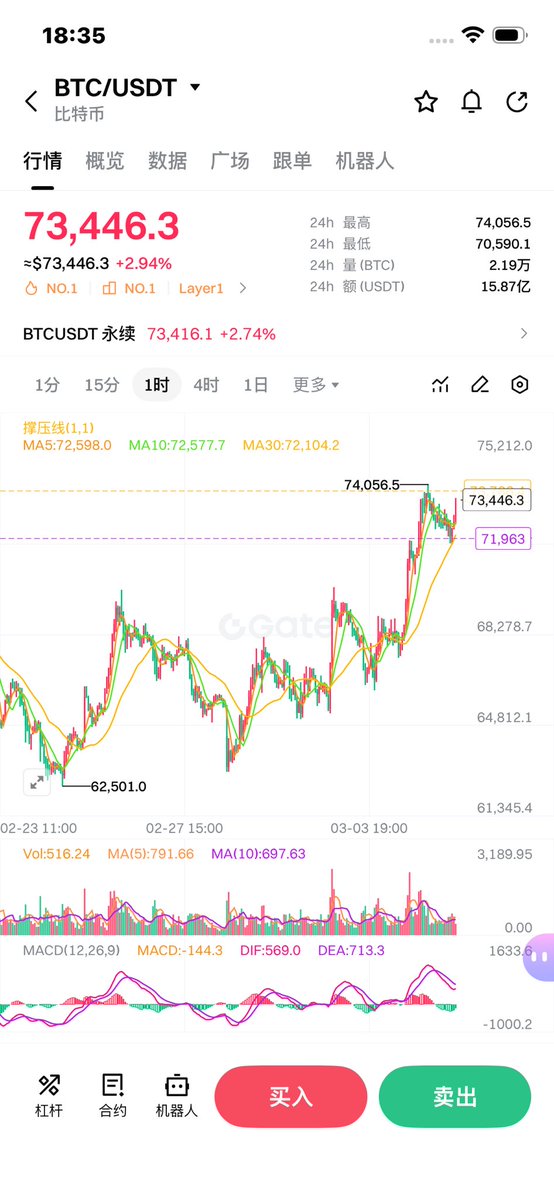 比特币突然冲上 74,050 美元,创下自2月5日以来的新高,加密货币总市值也重新站上 2.538 万亿美元。
