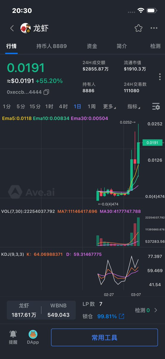 等上币安现货或合约之前,应该还有几波爆拉,所以说持有的还需等待,等待机会卖个好价格,没有货的,回调就买。目前市值1.4个亿美金,如果疯狂的话,可以搞到10个亿美金市值。