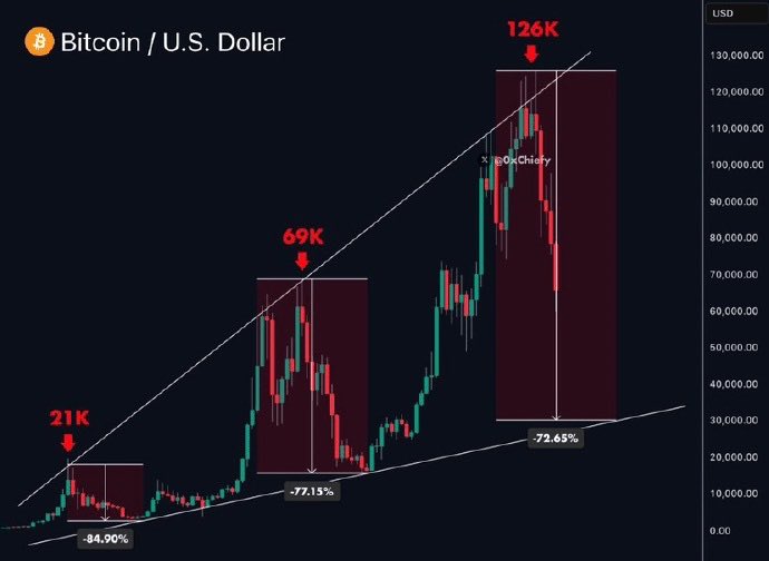 2025年:从 $109,000 跌到 $74,000,大家又说周期结束,崩盘临近;然后它又涨回 $126,000。