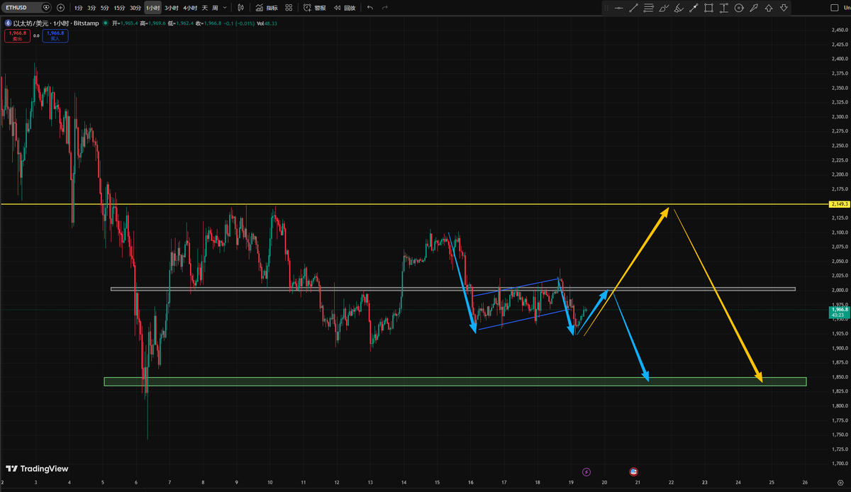 操作上的建议,如果做空就选择eth,形态走的偏空,点位一就是2000和2150附近的位置,短线操作2000上车需要做防守止损,中长线可以两个位置补仓上车,操作上灵活一点,没有做错的仓位,只有不能管理仓位的人。