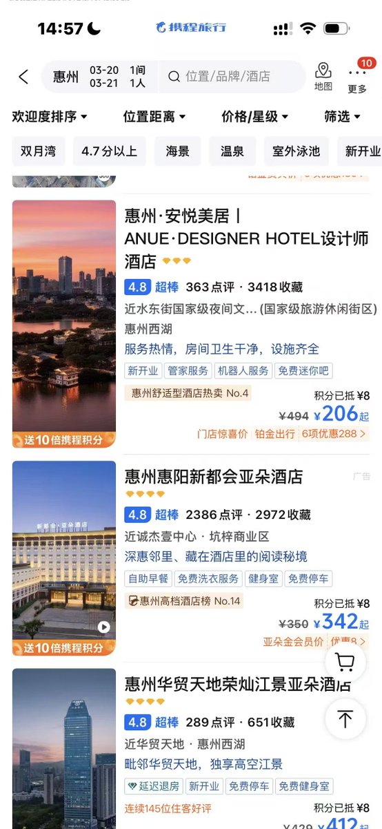 惠州酒店200-800都有,不知道孙哥请住哪个价位