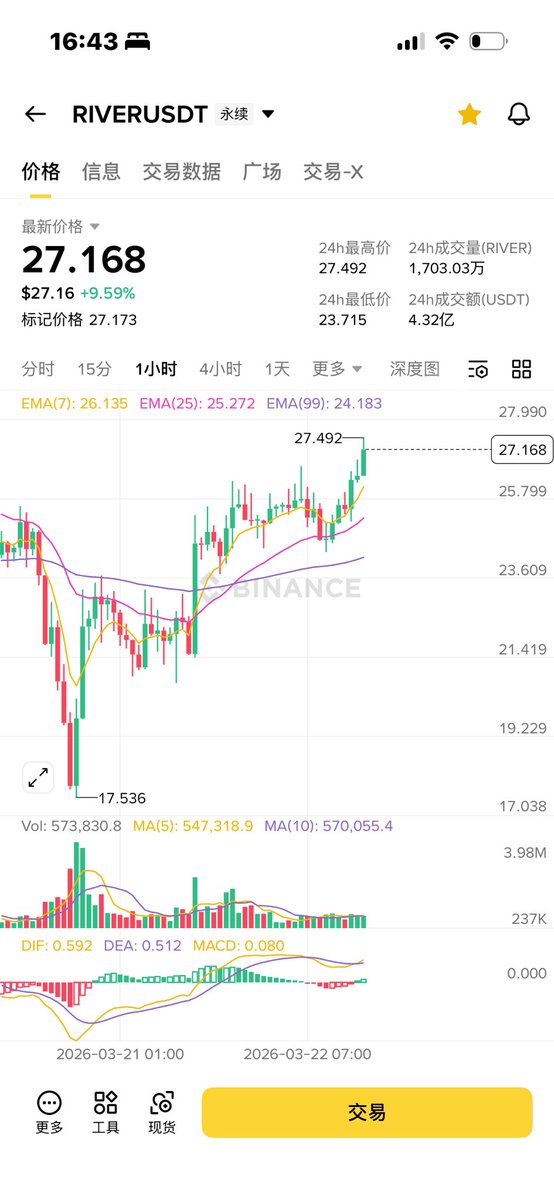 关键日子:3 月 22 日。 三天后会有约 110 万枚 $RIVER 的大额解锁。今天的拉升极有可能是为了在解锁前拉出足够的“护城河”空间。