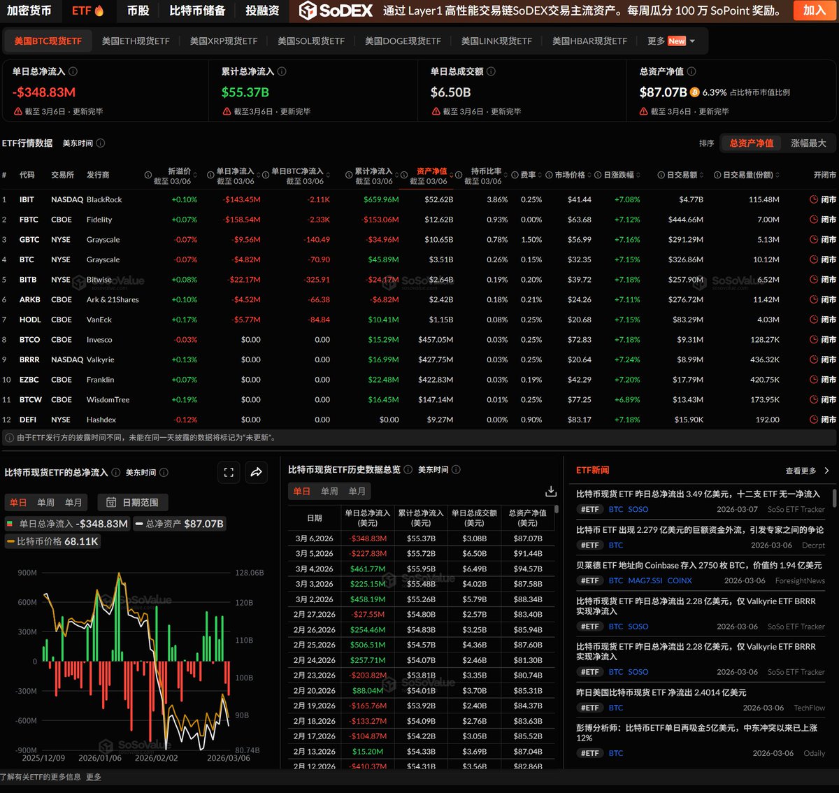 3月6日,美国比特币现货ETF单日净流出$3.49亿,12只ETF无一净流入,Fidelity FBTC一家就流出$1.59亿。