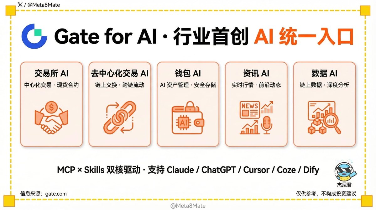 而这次 Gate @Gate for AI 把这五块打包进一个统一入口:CEX 交易、DEX 聚合、钱包操作、实时新闻、链上数据,标准化接口,接上去就能用。