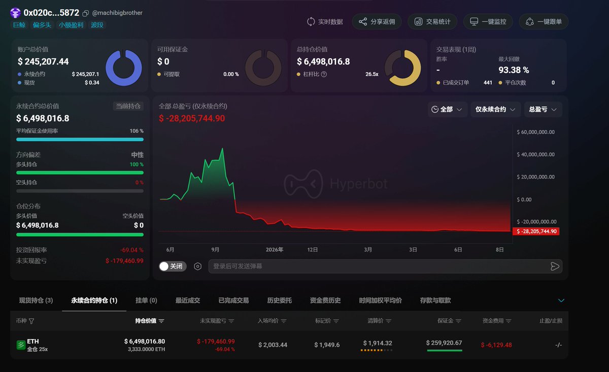 累计亏损约 $3000 万美元,今天又被强平了几次,当前 $ETH 持仓清算价$1,914,
