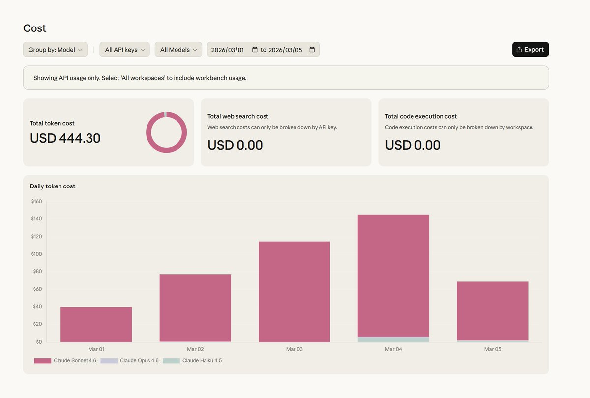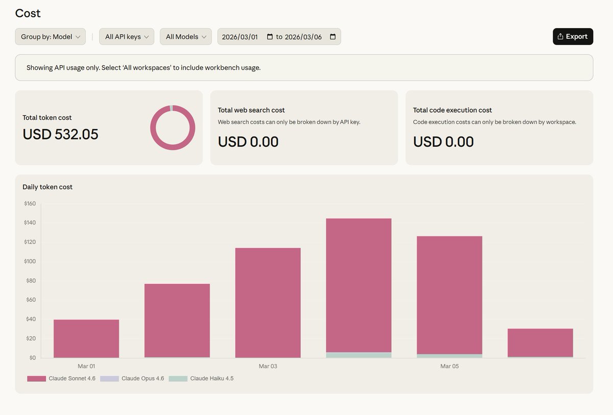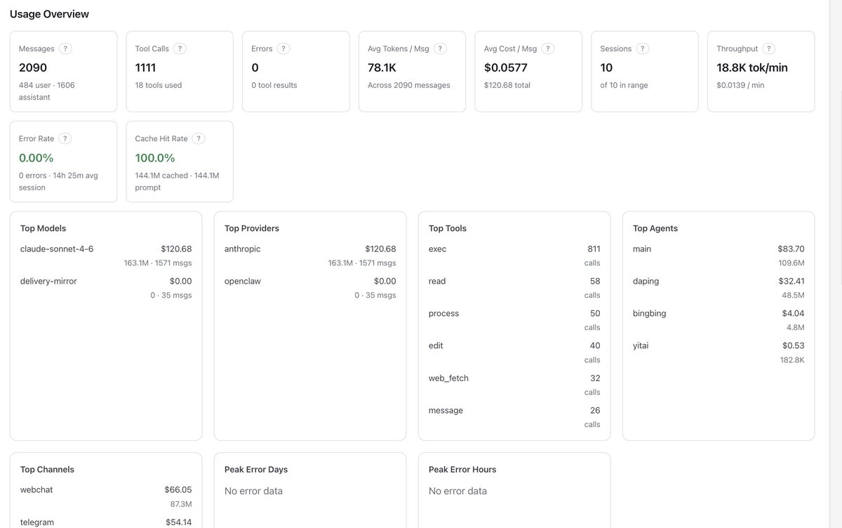玩 OpenClaw 6 天,Claude Sonnet 4.6模型, 烧了 $532 美金,平均一天 $100,月开支近 $3,000。