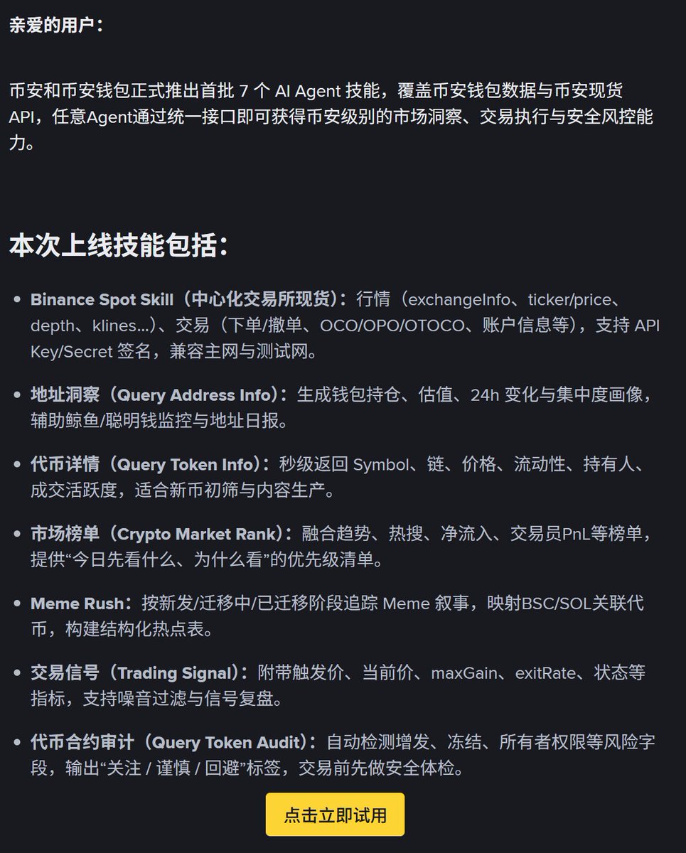 晚上我还在和朋友聊, CEX/DEX有没有一整套能直接接入分析和交易的API,毕竟模型再聪明,如果没有稳定的数据源和执行接口,很多东西都是空中楼阁,结果凌晨币安 @binancezh 就上线首批 7 个 AI Agent Skills,让每个 Agent 都拥有“币安级别的大脑”。