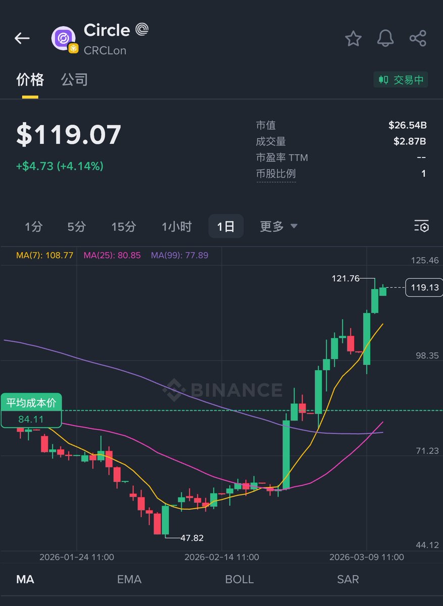 Circle @circle 昨天涨了8%,股价破$120, 之前体验链上美股的时候买了一些 $CRCL ,中间一度腰斩,现在盈利快50%了,这波动,不愧是币圈概念!~