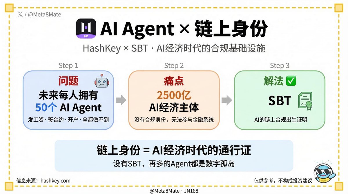 SBT(灵魂绑定代币)= AI Agent的链上合规出生证明。行为轨迹、信用履历、授权范围,全部上链,不可转让,不可篡改。你的Agent干了什么,能干什么,有没有合规记录,链上一查一个准。肖风博士说:「AI与区块链是一体两面」,就是这个意思。