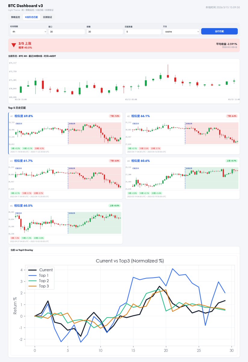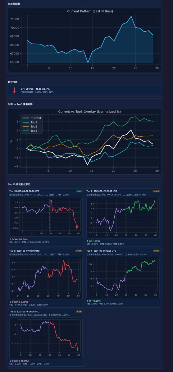 核心逻辑:融合EMA、MACD等8维指标,在过去6年BTC数据中匹配最相似的K线走势。