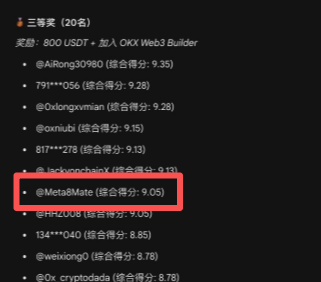 感谢 OKX @okxchinese 提供的 Skill 和认可,杰尼君的作品在 OKX AI 松大赛综合评分 9.05,荣获三等奖。