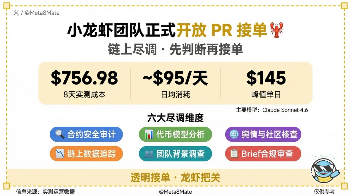 当然,不是什么项目都接,每个项目先跑一遍完整尽调:链上数据、舆情、合约审计,判断没问题再接,有问题的项目方直接拒绝,每次龙虾接的PR,我都会声明 + 附分析报告,公开透明。