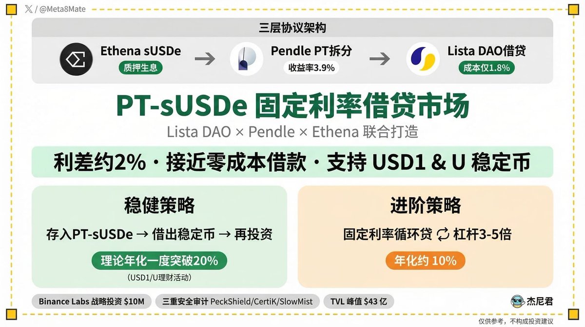 PT-sUSDe 自带固定年化约 3.9%,Lista 借款成本年化只有 约1.8%——固定的。