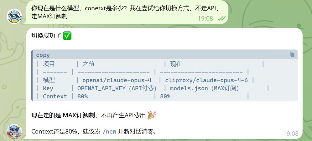研究了半天,终于把OpenClaw大饼的模型,从每天烧 $200 走API的Opus 4-6,切换到走MAX订阅制,每月只要 $200 。