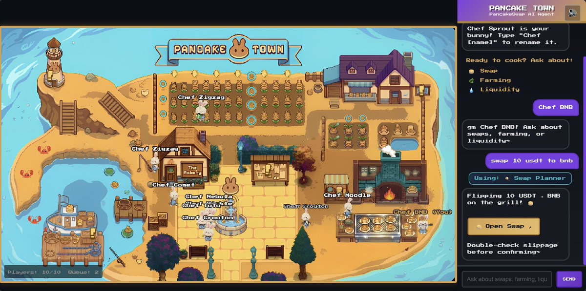 An interactive AI-agent world where you chat with PancakeSwap’s AI to discover the best swaps, pools, and farms, and watch your bunny make it happen in real time.