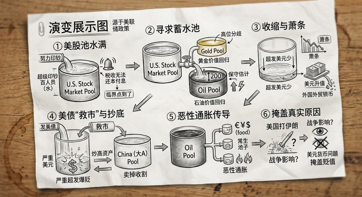 2️⃣美国要想办法给池子放水,于是首先找了黄金这个池子,往里面灌水,表达为黄金的价值回归;如今,黄金在高位已经开始出现分歧。现在又找石油这个池子,往里面灌水(蓄水池),灌多少?保守估计到200美元,并且速度会很快,表达为石油的价值回归。
