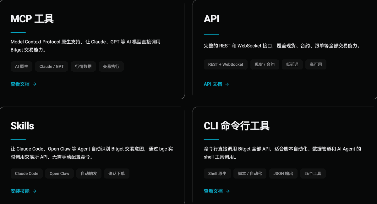 以前如果想让 AI 帮你操作交易,我们得把一堆 API 文档贴给它,让它理解怎么调用接口。现在简单很多,三分钟就能在Claude 或者Openclaw配置好 Bitget的Skills,AI 就能直接调用交易所的一些工具,我们不需要写任何策略代码,只要把交易逻辑说清楚,AI 就能帮我把它变成可执行的指令。我翻了一下工具列表,大概五十多个模块,现货、合约、跟单、资金管理这些都有。