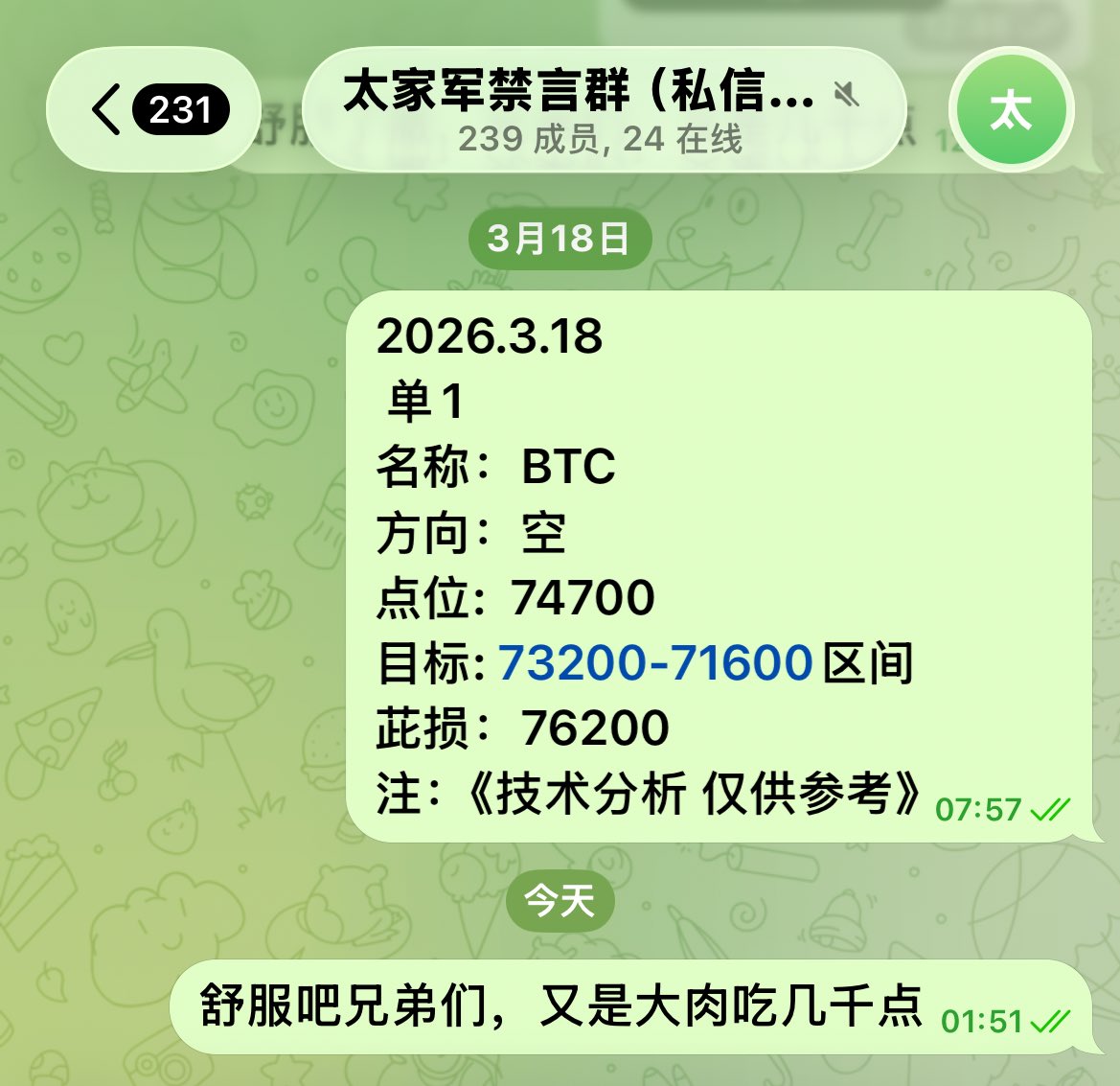 昨晚发在禁言群72800-73500做空,成功拿下3000点左右,恭喜跟上的兄弟们吃肉