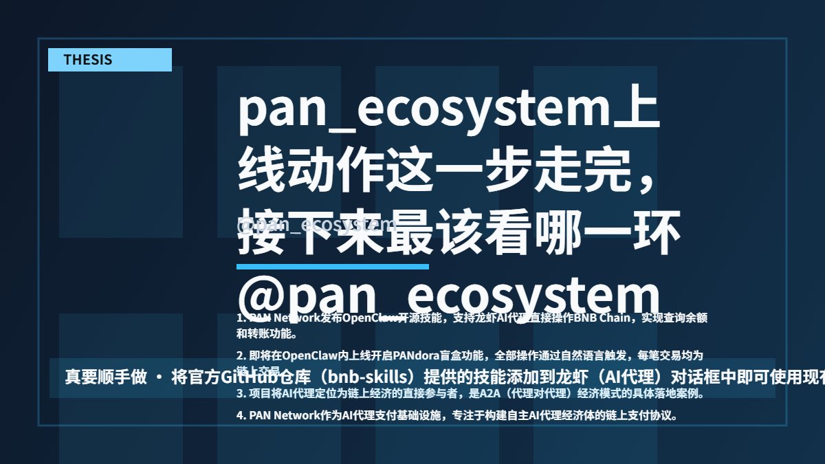 1. PAN Network发布OpenClaw开源技能,支持龙虾AI代理直接操作BNB Chain,实现查询余额和转账功能。