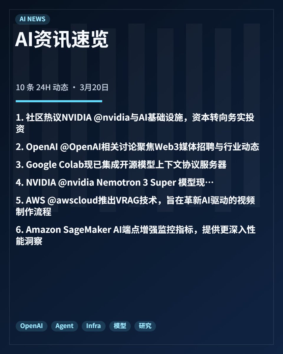 1. NVIDIA @nvidia 的 Nemotron 3 Super 模型现已在 Amazon Bedrock 平台上线,开发者可以直接通过 AWS @awscloud 服务调用这一高性能模型,为应用构建提供了新的选择。