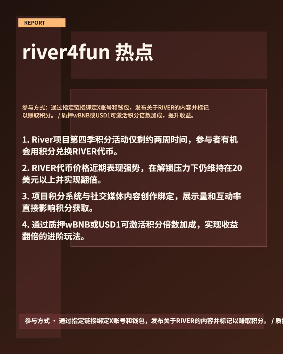 1、通过指定链接绑定X账号和钱包,发布关于RIVER的内容并标记以赚取积分。