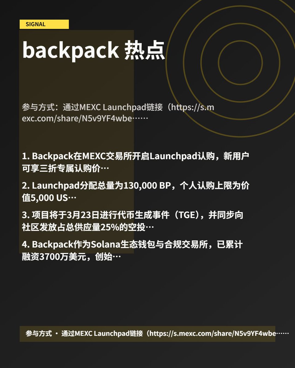 1、Backpack在MEXC交易所开启Launchpad认购,新用户可享三折专属认购价,1 BP = 0.1 USDT,远低于市场预期价。