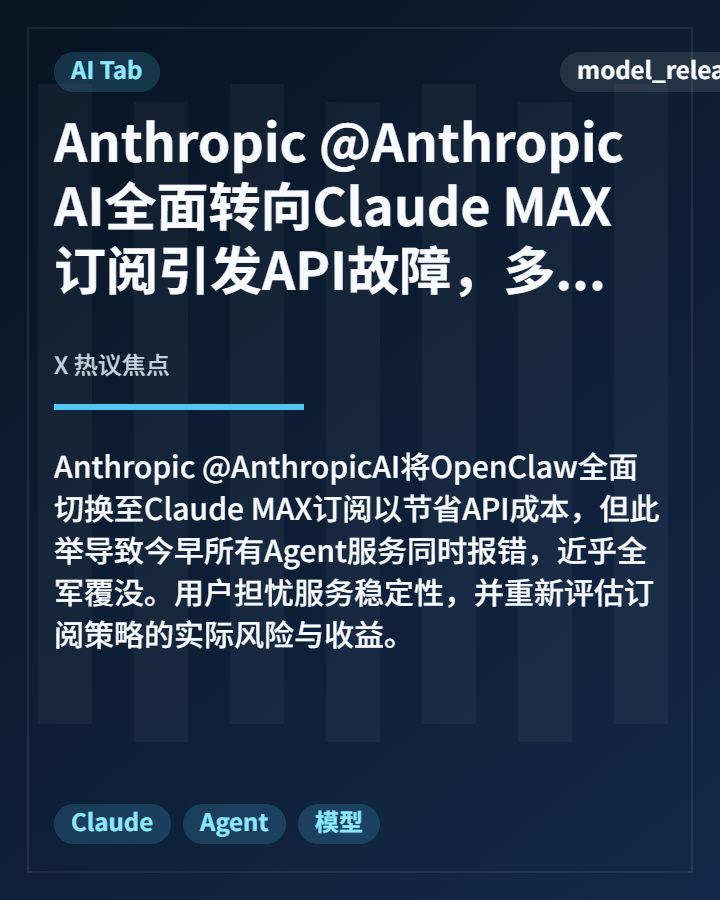 1. Anthropic @AnthropicAI 全面转向 Claude MAX 订阅引发连锁反应,导致多个 Agent 服务 API 故障,服务稳定性引发用户担忧。