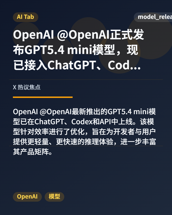 2. OpenAI @OpenAI 正式推出 GPT5.4 mini 模型,现已接入 ChatGPT、Codex 及 API,主打轻量与快速推理,优化开发者体验。