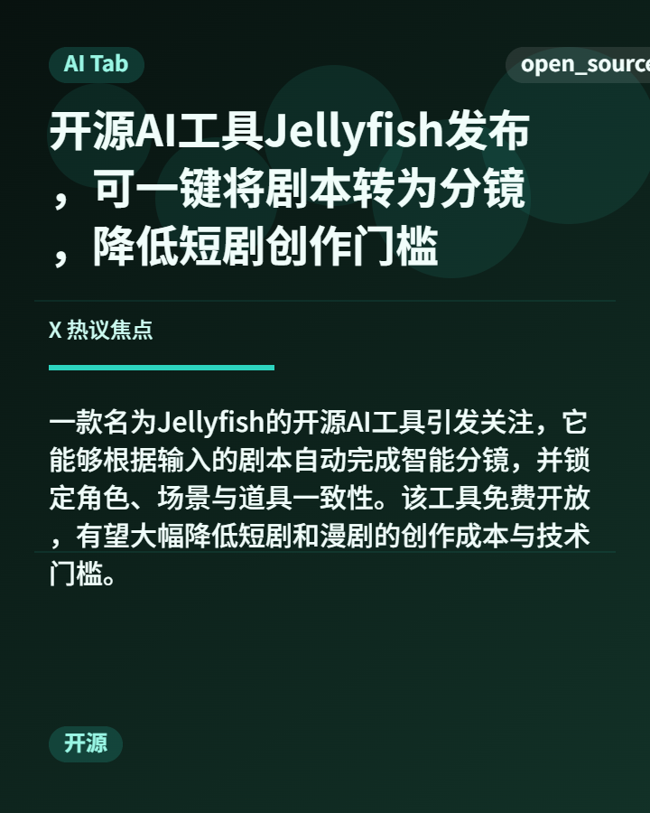 3. 开源工具 Jellyfish 发布,可一键将剧本转为分镜并保持角色场景一致性,旨在大幅降低短剧与漫剧的创作门槛。