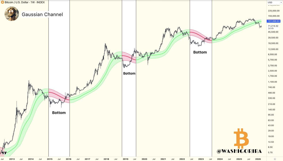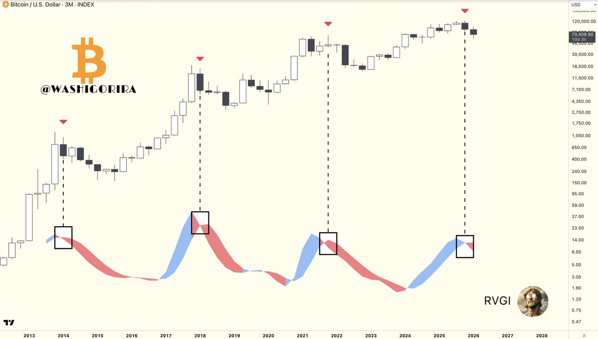 Previous cycle this area marked relative bottom, where BTC stops underperforming gold and starts to regain strength.