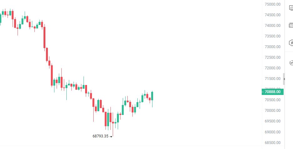 ✅️大饼昨晚最低回调到68800附近,鱼哥挂的68500多单没接到,就差300刀,有点可惜!回调的区间找对了,位置挂低了一点,刚好也是打回整体的支撑区间开始反弹,截止目前盘口数据,比特币报价70700附近,以太坊报价2140附近
