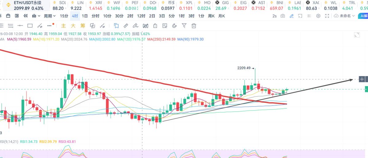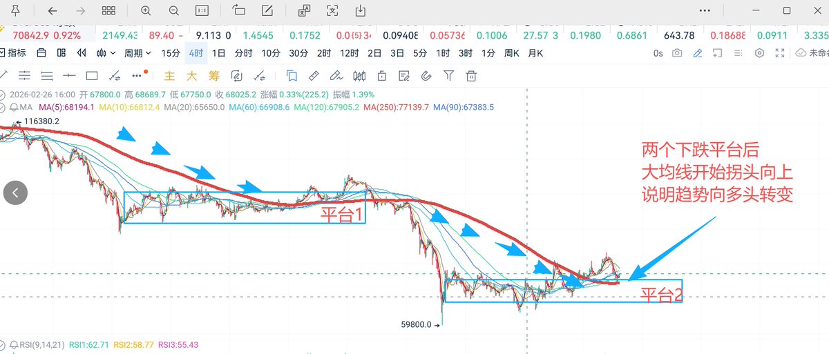 1、BTC走势经过两轮下跌,构筑两个支撑平台,价格突破4小时MA250 一波拉升后回踩大均线,目前我们看到红色大均线开始拐弯向上,这代表着市场已经进入多头趋势,看涨、即使有坏消息黑天鹅也不用担心,跌破就是做多机会,顺利的话4月份能打一个翻身仗