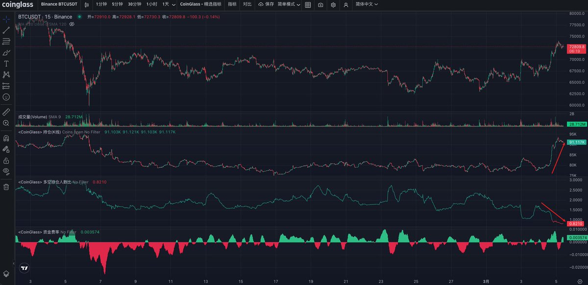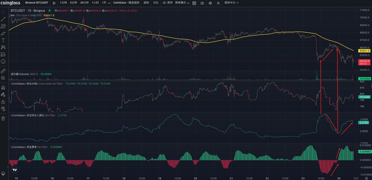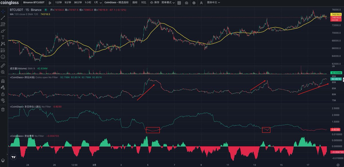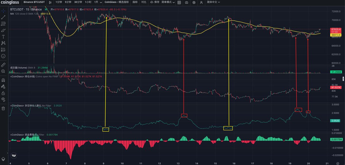 我自己之前是一直有详细分享过一套震荡指标,多空比和持仓数据、后面又加入了现货杠杆多空比这个数据,该数据通过最近大半年的表现来看也是属于震荡指标,另外再叠加大B网的溢价、资金费率就基本可以确定出震荡的底部和顶部了,同时在震荡的中期阶段会有一波力度比较大的冲高或者二探的行情,但只会有一波,这时候也要有个心理预期;