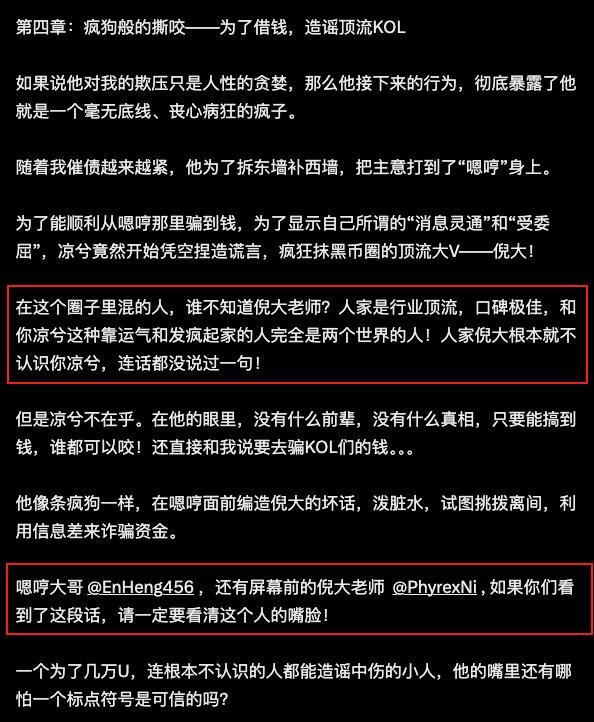 凉兮虽然现在负债累累,但凉兮不坑散户(主动给凉兮钱的小白除外),其专挑那些想利用凉兮流量的KOL、大户坑,算是一个愿打、一个愿挨;