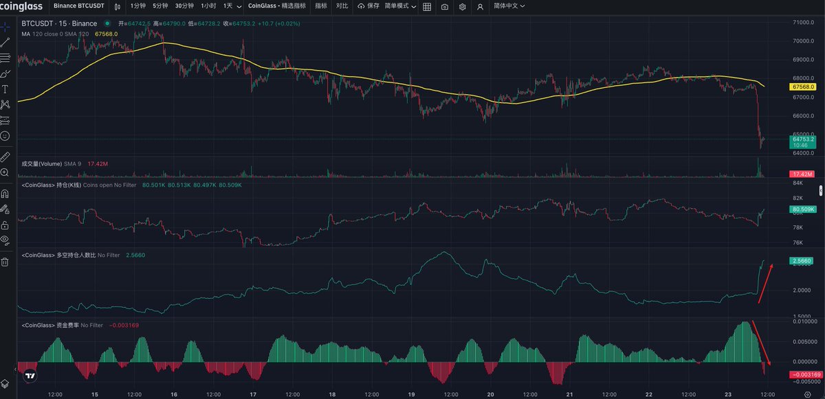 合约数据:今天上午以太和大饼加速下跌的时候,根据持仓和多空比数据可以看到有明显的多头止损离场,多空比和持仓也来到了符合震荡底部的情况;
